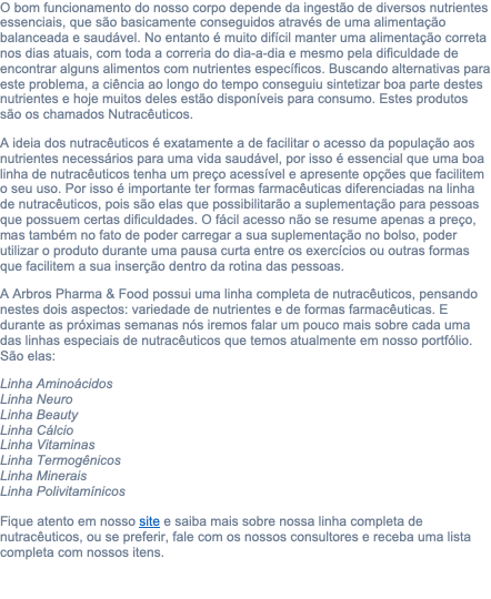A Arbros Pharma & Food possui uma linha completa de nutracêuticos, pensando nestes dois aspectos: variedade de nutrientes e de formas farmacêuticas. E durante as próximas semanas nós iremos falar um pouco mais sobre cada uma das linhas especiais de nutracêuticos que temos atualmente em nosso portfólio. São elas: