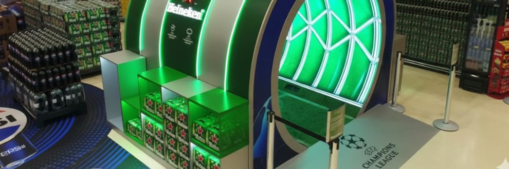 - Túnel Heineken UCL:a ativação recriou o túnel de entrada dos jogadores da Champions League, oferecendo uma experiência imersiva no ponto de venda. Revestido internamente com LED e equipado com sensor de presença, o túnel acionava conteúdo audiovisual exclusivo, fazendo o shopper se sentir como um jogador entrando em campo. A ativação ficou instalada por um mês, no período da campanha da UCL, e incluía exposição de produtos da marca Heineken® com promotoras aos finais de semana para engajar ainda mais o público.