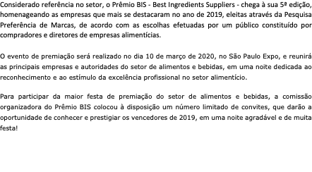 Considerado referência no setor, o Prêmio BIS - Best Ingredients Suppliers - chega à sua 5ª edição, homenageando as empresas que mais se destacaram no ano de 2019, eleitas através da Pesquisa Preferência de Marcas, de acordo com as escolhas efetuadas por um público constituído por compradores e diretores de empresas alimentícias.